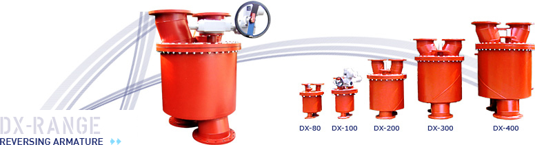 The most important component of the automatic brush cleaning system is the special reversing valve, designed as 4wayvalve in the nominal size from 80 mm to 600 mm, respective for nominal flow rate from 50m³/h to 3000 m³/h. In case of larger nominal sizes respect. flow rates, the flow direction will be reserved by butterflyvalves a method, which is approved in the power industry for many years. Beside the functional security of longterm operation the pressure drop and the leakage rate of the reversing armature are very important parameter. In Kalvo’s type DX they perform extreme low values. |